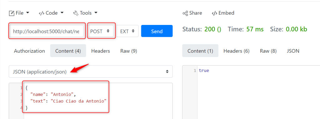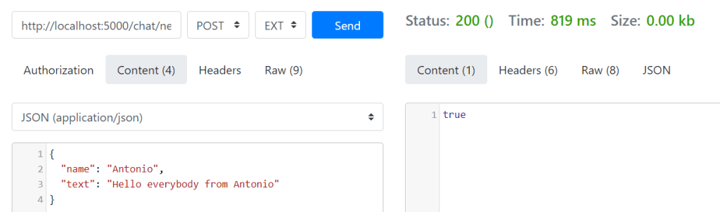 In the POST request we have to write two properties: name and text. We use Json format to send this message. The response will be a bool that returns true if the message has been saved in the database and false if not.